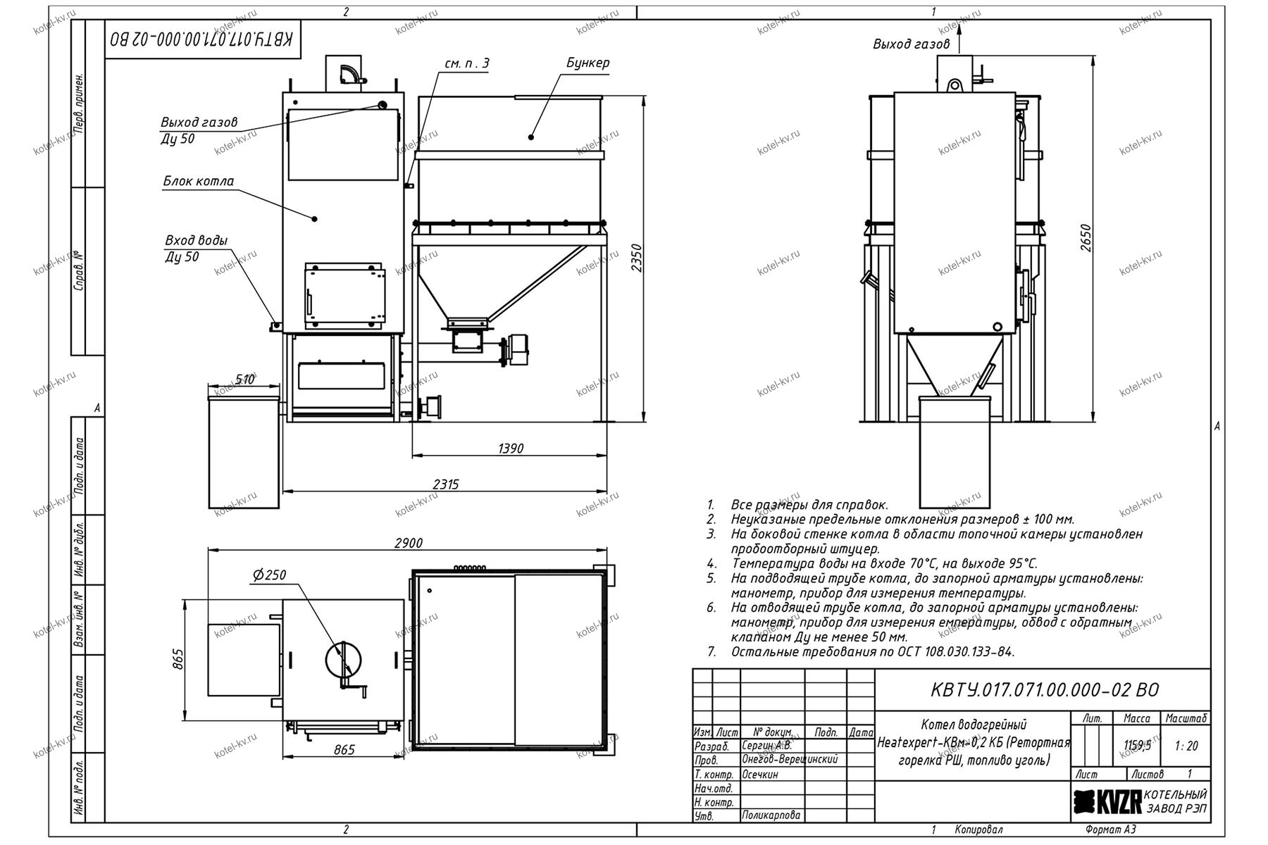 Угольный котел 0.2 МВт с автоматической подачей конструктивно состоит из следующих блоков:
